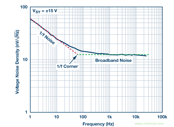 上图是AD4622 运放的电压噪声谱密度图,我们可以看到有两个不同的区域。左边是1/f噪声区,右边是宽带噪声区。1/f噪声和宽带噪声之间的交越点称为1/f转折频率,此时谱密度是白噪声的2倍对应的频率点。