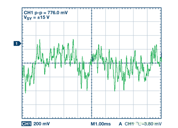 上图是典型的1/f噪声的时域波形图,呈现随机游走的特性,低频分量高。显示了ADA4622-2的0.1 Hz至10 Hz噪声。噪声非常低,典型值仅为0.75 μV p-p。示波器上的结果除以10000倍增益得到。