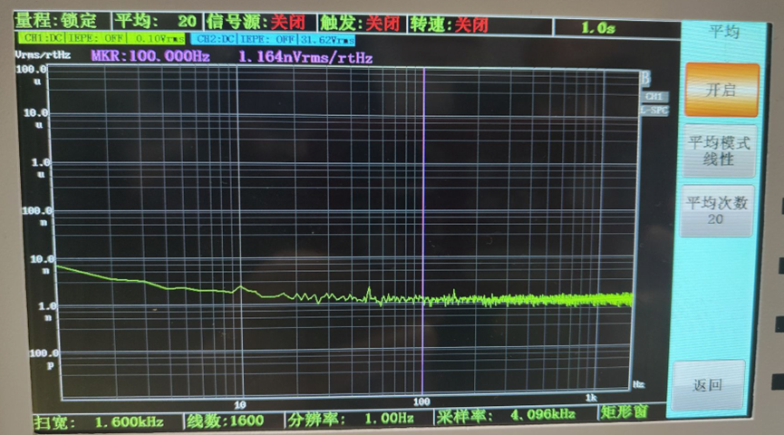 上图是50欧电阻的等效热噪声测试图,外部增益放大1000倍测试结果,等效热噪声为1.2nV/sqrt Hz(at 100Hz),50欧理论热噪声为0.92nV/sqrt Hz。