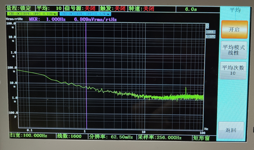 DSA640具有10nV/sqrt Hz的底噪,且转角频率低。结合外置的精密前置放大器和仪器外部增益参数设置,能直接测试出:小于2nV/sqrt Hz的热噪声本底,1/f噪声的转角度频率低于4Hz。满足绝大多数半导体模拟前端的低频噪声测试需求。